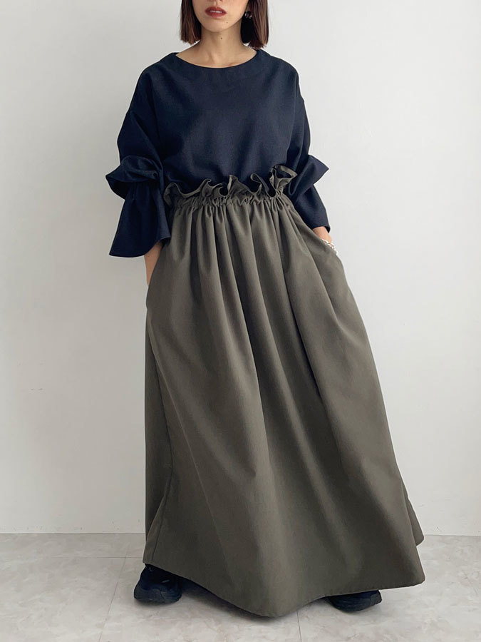 フリルウエストが際立つ、シンプルなロングスカート。