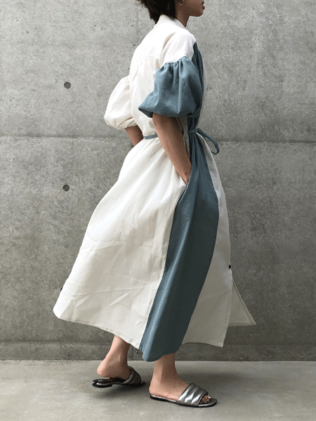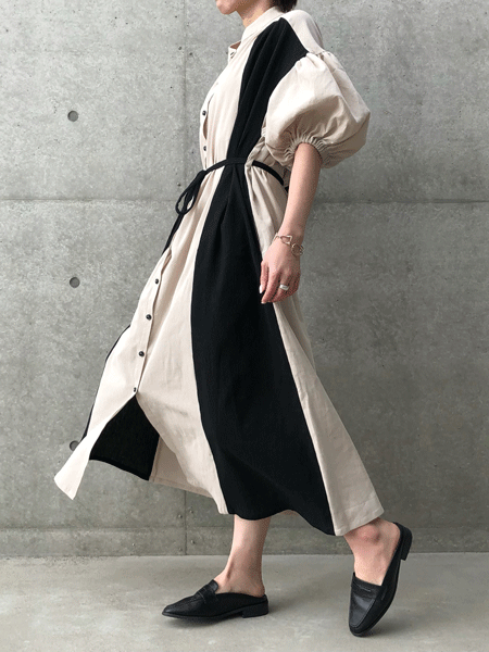 バイカラーパフスリーブゆったりワンピース