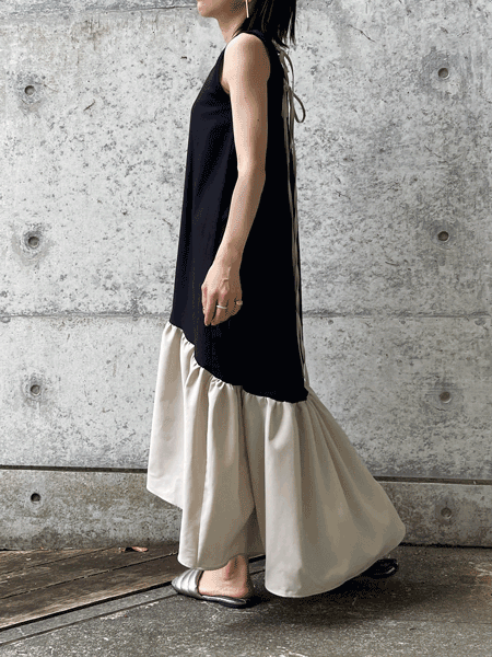 長い2本のリボンは、背中の開きも気になりくい効果もあります。