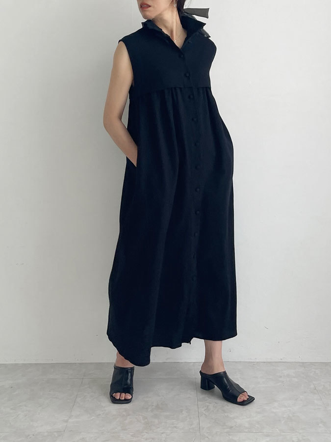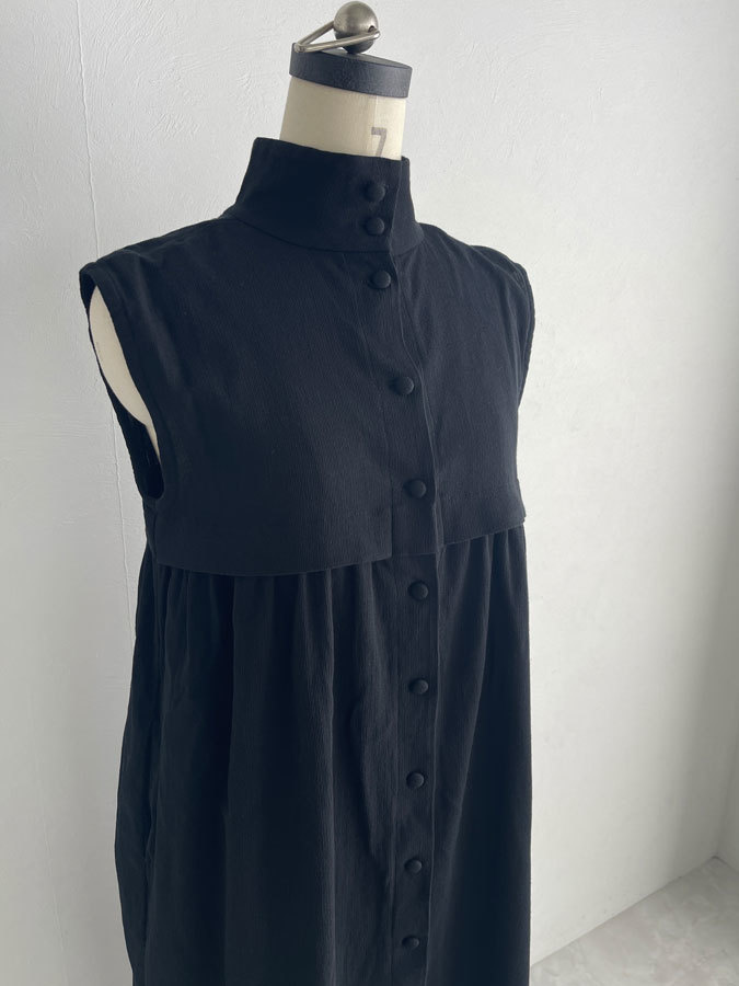今までのハイネックドレスはドレスとしての着用でしたが、こちらのタイプは裾までボタンがついているのでロングジレのようにもお楽しみいただけます。