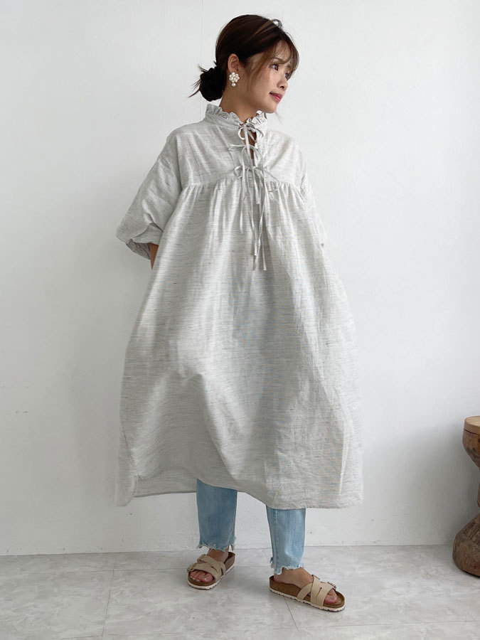 フリルネックリラックスドレス(cotton linen)