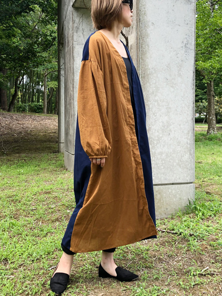 秋を感じさせてくれるネイビー、キャメルのバイカラー羽織物。