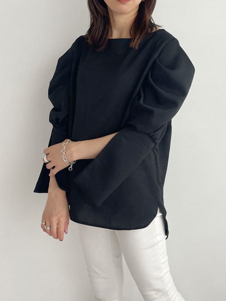 ドレープがかったパフスリーブに、肘下からはスリットスリーブ。