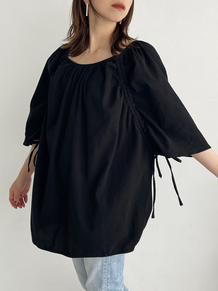 ゆったりサイズのドルマントップスですが、前身頃の紐をシャーリングさせると全く異なる印象になるトップスです。